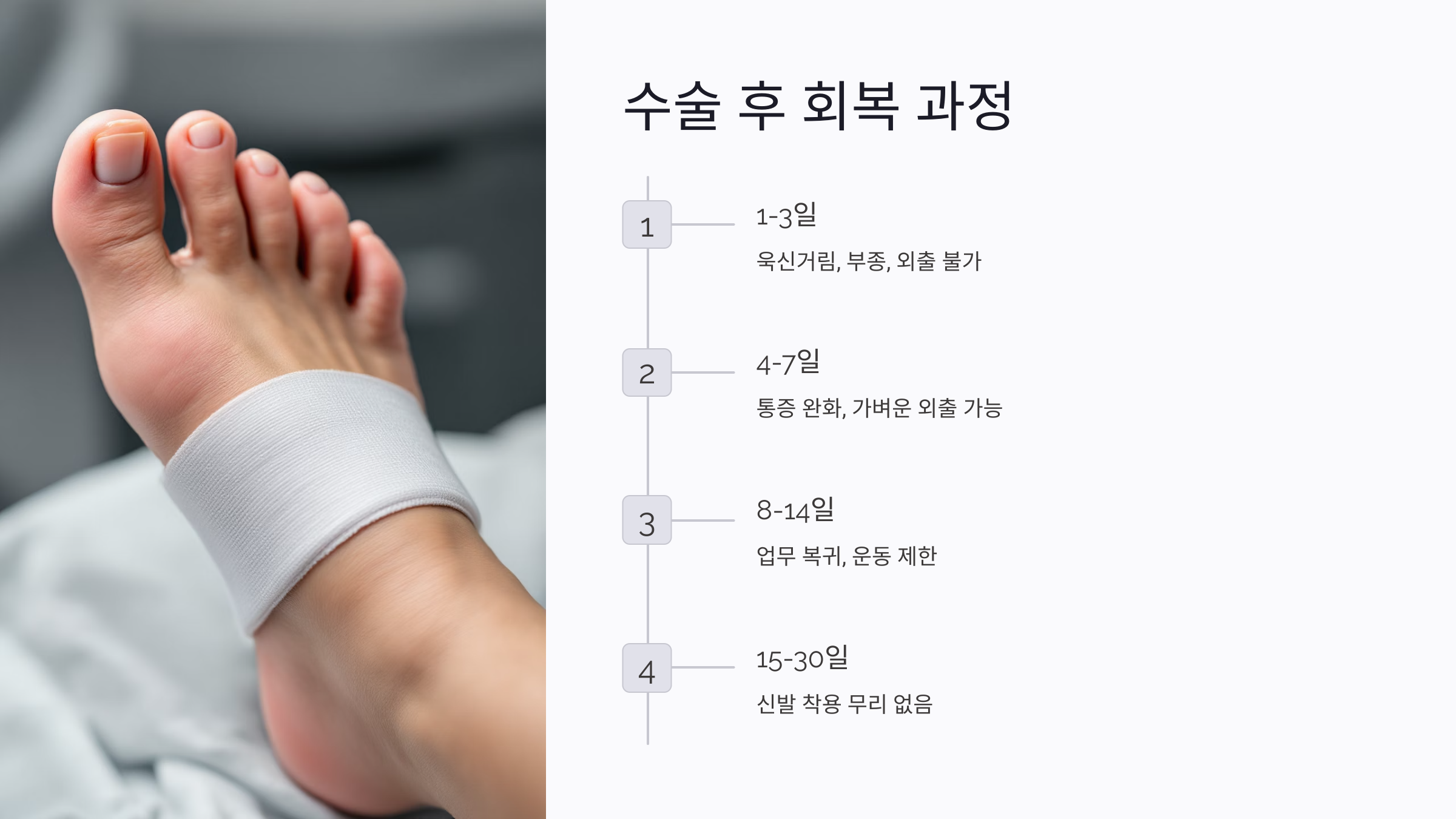 수술 후 일주일쯤 지나니 통증은 거의 사라졌습니다. 일상 생활도 가능했고, 간단한 외출이나 업무 복귀도 무리가 없었습니다. 단, 운동이나 장시간 서 있는 활동은 피해야 했어요. 보통 2주가 지나면 대부분 회복되며, 한 달쯤 되면 신발 착용에도 전혀 문제가 없었습니다.
