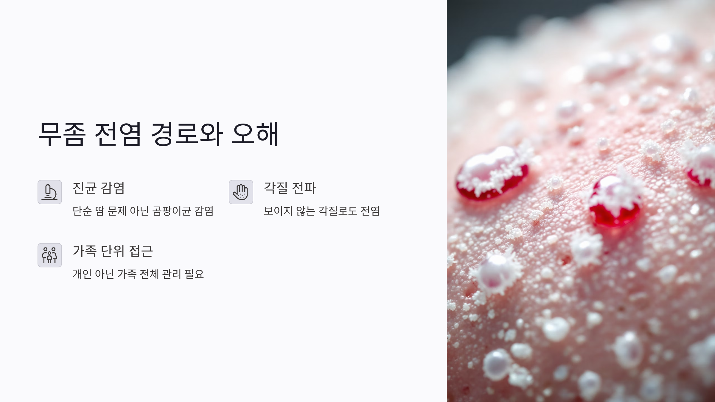 무좀약을 바르고도 계속 재발하고 있다면, 그 원인은 내 피부가 아닌 가족과 공유하는 수건, 슬리퍼, 발매트일 수 있습니다. 무좀은 전염성이 강한 진균 감염으로, 가족 내 감염은 생각보다 더 흔하게 발생합니다. 이 글에서는 무좀균의 전염 경로를 중심으로, 가족 간 감염을 막기 위한 실천 가능한 생활 수칙을 완전히 정리했습니다. 지금 우리 집 환경부터 점검해보세요.